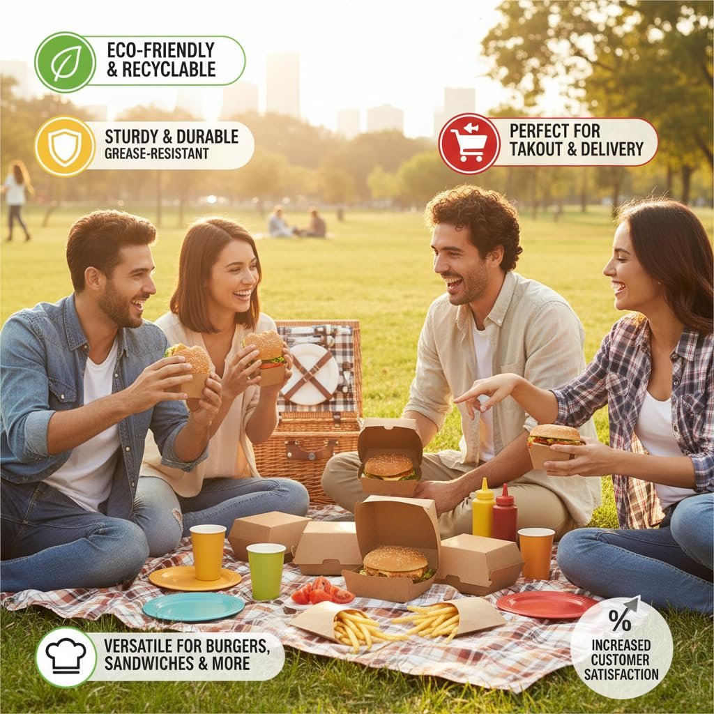 Kraft Paper Burger Packaging Box – Eco-Friendly, Leak Proof & Grease Resistant Lock-Able Fast Food Boxes for Burgers, Fries & Snacks
