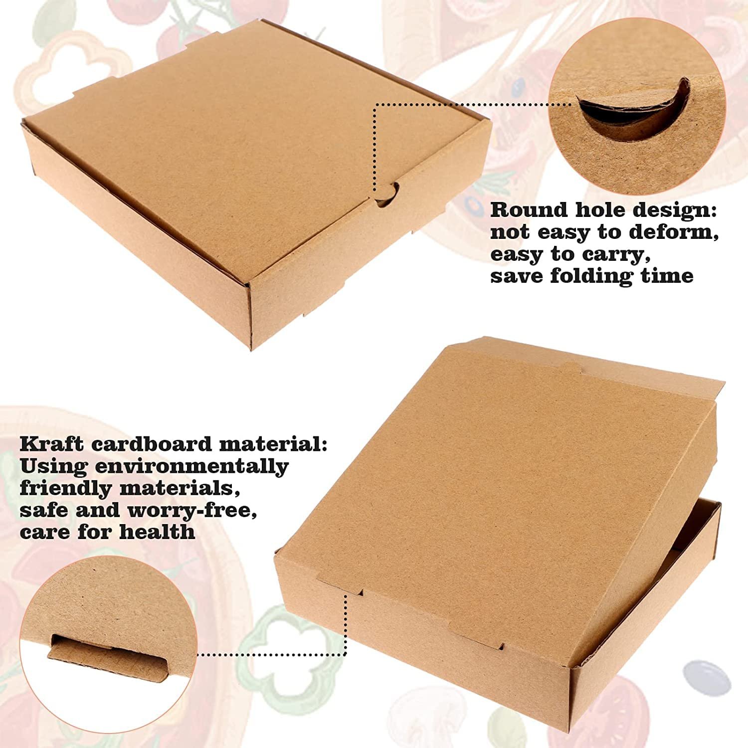 These kraft paper pizza boxes are made from food-grade materials, ensuring safe contact with hot pizzas. The boxes are odor-free, non-toxic, and suitable for direct food use, making them compliant with hygiene standards for food service businesses.